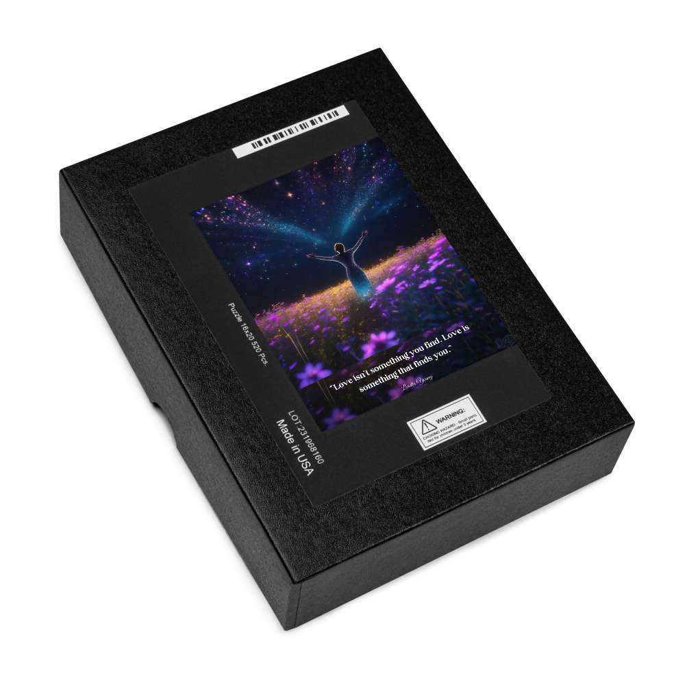 Embrace the unexpected and serendipitous nature of love's arrival with our Serendipitous Love HD Jigsaw. Featuring the touching quote, "Love isn't something you find. Love is something that finds you," by Loretta Young, this puzzle beautifully captures the essence of love's spontaneous and unexpected nature. The artwork showcases a person standing in a field of wildflowers with their arms outstretched, basking in the sunlight, symbolizing the joy and surprise of love finding you.